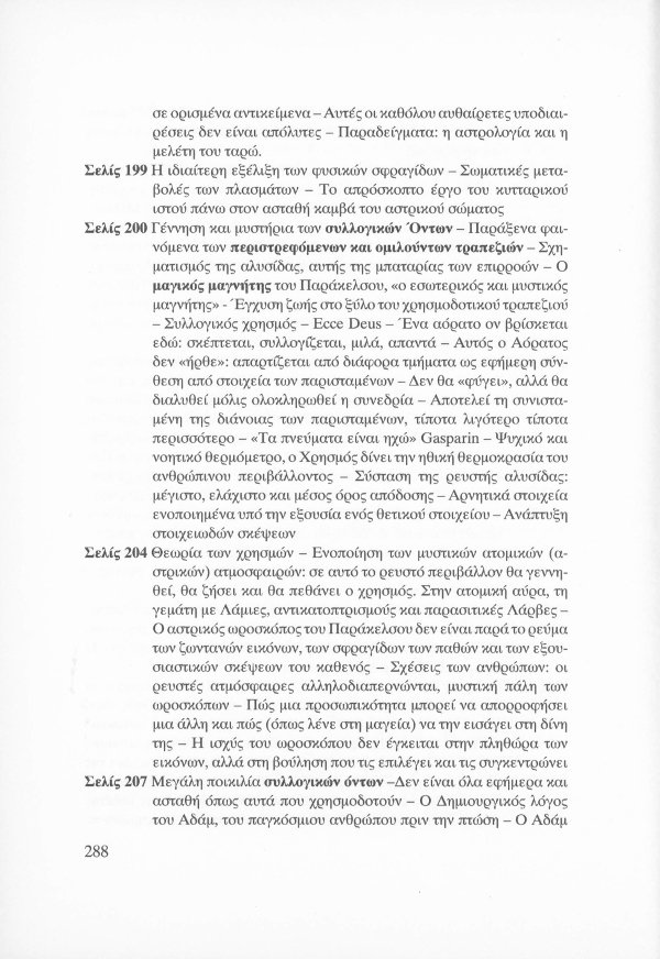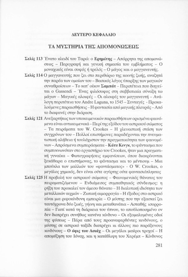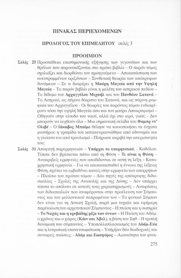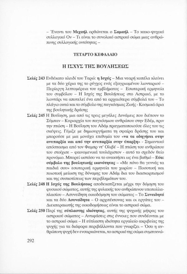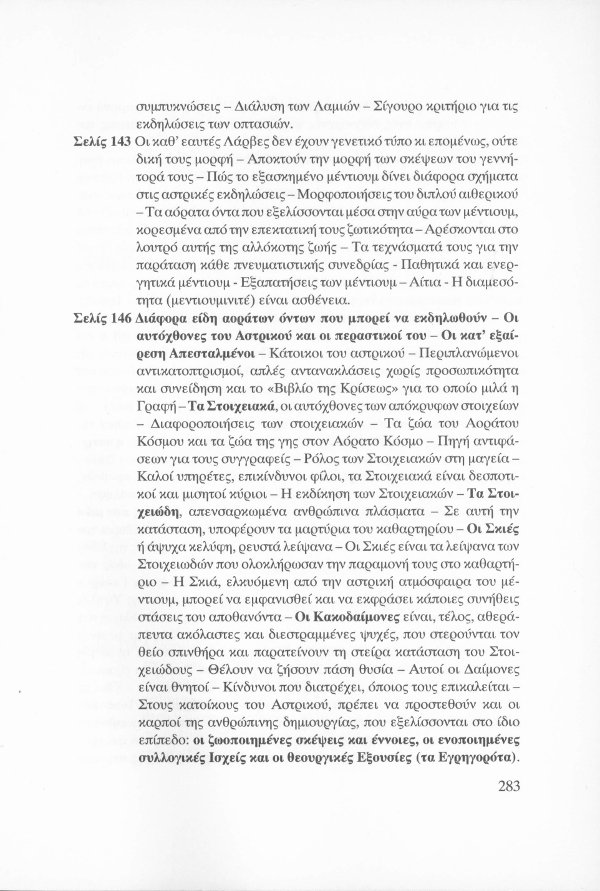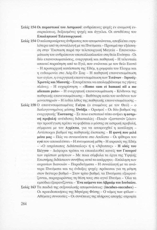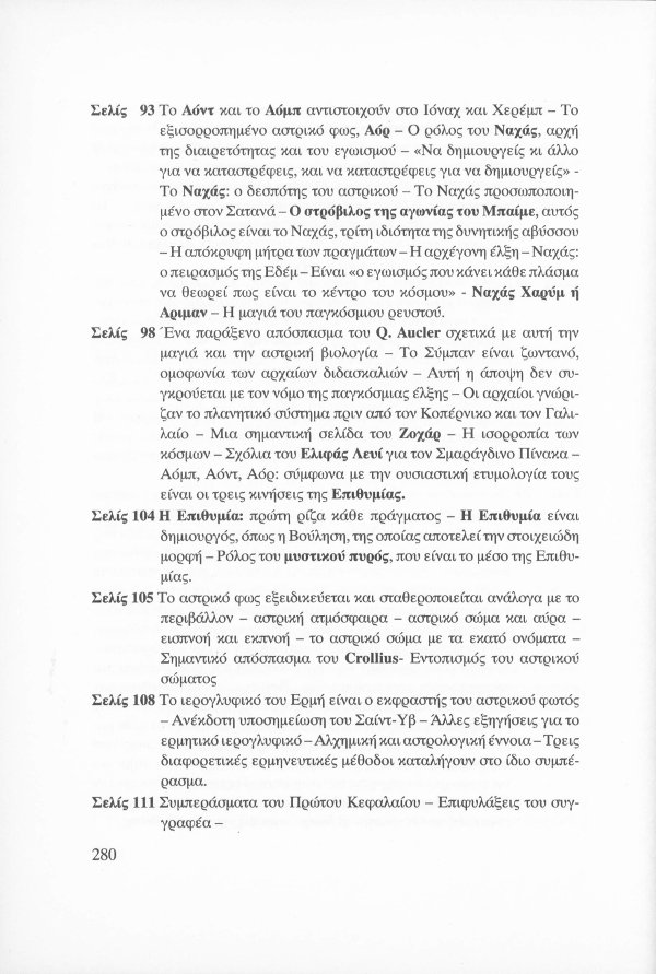 Η εσωτερική έννοια του Κατακλυσμού · Το Έρεβος του Ορφέα και η Άβυσσος της Εκάτης · Εκδηλώσεις Αγγελικών και Δαιμονικών μορφών μέσω του Αστρικού Φωτός · Αστρικό σώμα και παραισθήσεις · Οι κάτοικοι του Αστρικού πεδίου · Παρασιτική φύση συγκεκριμένων όντων του Αστρικού · Οι Δαίμονες ως ανθρώπινα δημιουργήματα μέσω της βουλήσεως και της φαντασίας · Μαντικές τέχνες · Πνευματισμός · Αστρικός ωροσκόπος · Τα Εγρηγορότα ως συλλογικές οντότητες με ανυπολόγιστη διάρκεια και ισχύ · ΜΙΧΑΗΛ: Το Εγρηγορός της Δωρικής Μυήσεως και Κοινωνίας των Εκλεκτών, με το οποίο επικοινωνούσε ο Μωυσής · ΣΑΜΑΗΛ: Το κακό - ψυχικό Εγρηγορός των διεστραμμένων βουλήσεων ·