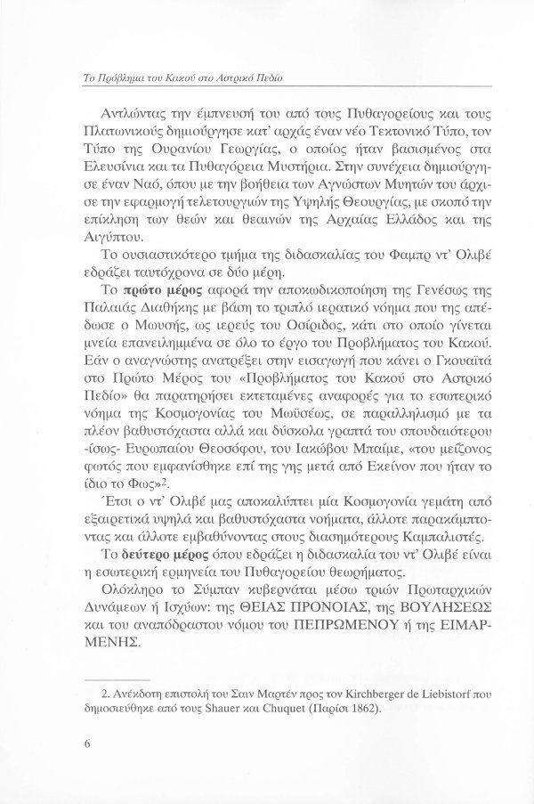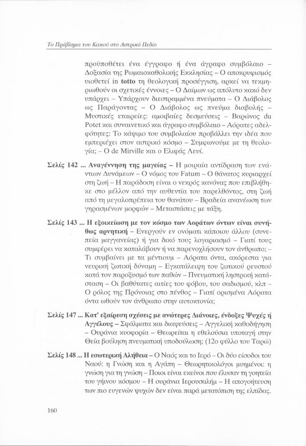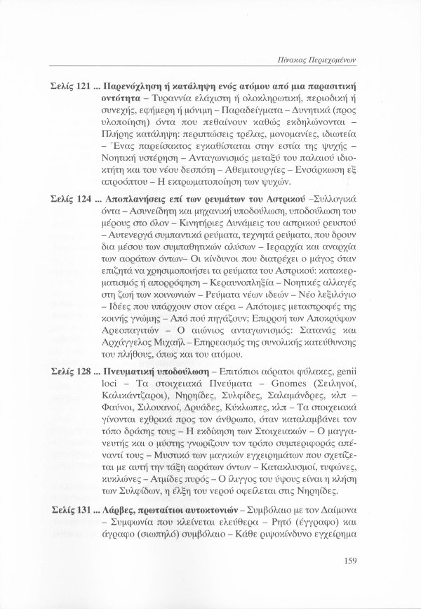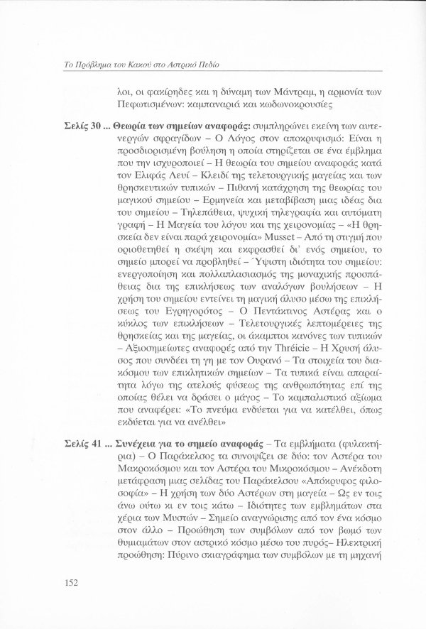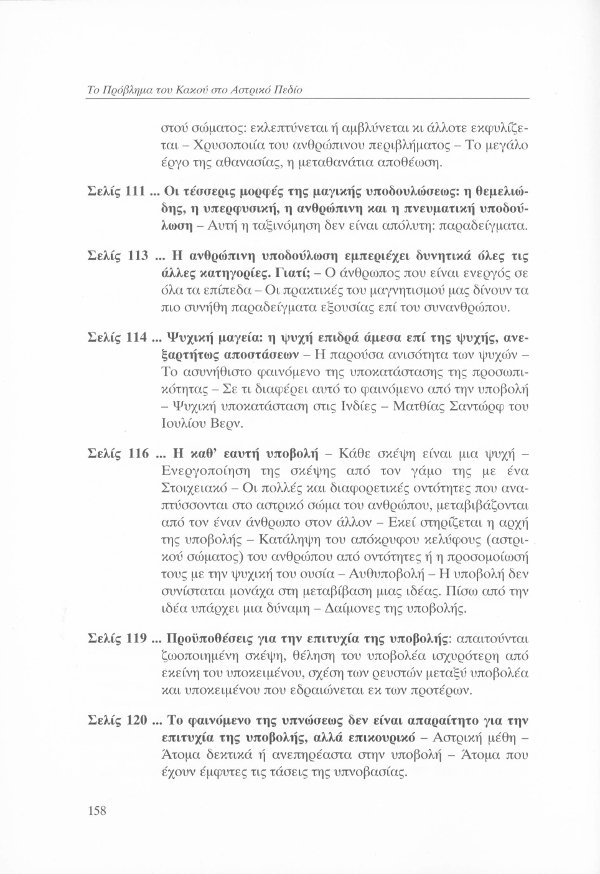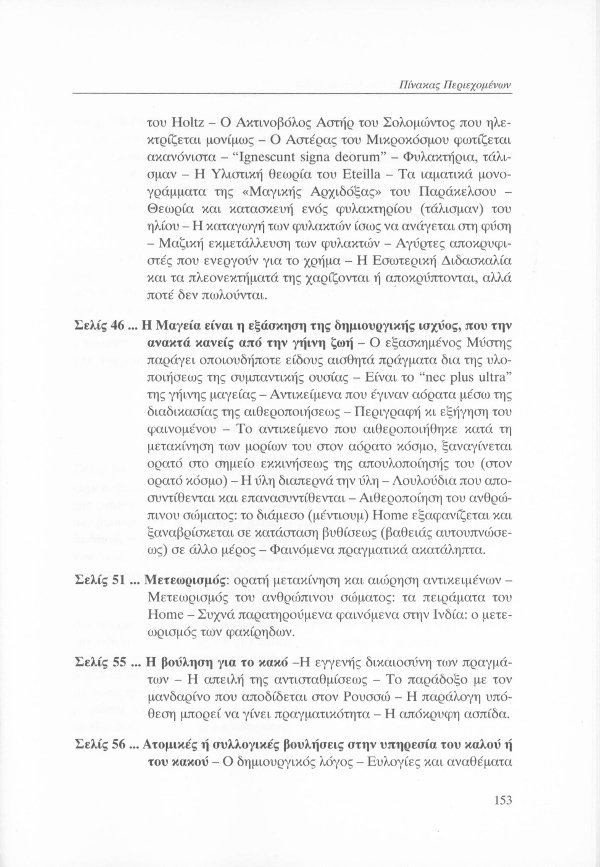 Κάθε ισχύς στην Μαγεία έγκειται στην Βούληση και την Πίστη · Η Μαγική `Αλυσος και τα μυστήριά της · Η Μαγεία ασκείται άμεσα δια της δράσεως του αστρικού σώματος επί των ασταθμήτων ρευστών κι έμμεσα δια της ισχύος της βουλήσεως επί των αοράτων όντων · Μαγνητισμός · Υποβολή · Ο Λόγος στον Αποκρυφισμό · Ο Πεντάκτινος Αστήρ και ο κύκλος των επικλήσεων · Ο Αστήρ του Μακροκόσμου και ο Αστήρ του Μικροκόσμου κατά τον Παράκελσο και η χρήση τους · Σημεία αναγνωρίσεως από τον ορατό στον αόρατο κόσμο · Η Μαγεία είναι η άσκηση της δημιουργικής ισχύος που την ανακτά κάποιος από την γήινη ζωή · Μετεωρισμός: ορατή μετακίνηση και αιώρηση αντικειμένων και ανθρώπων · Ατομικές ή συλλογικές βουλήσεις στην υπηρεσία του καλού ή του κακού · Ο αφορισμός αποτελεί είδος ιερής βασκανίας · Η προΰπαρξη της ψυχής και η καταβύθισή της στο βάραθρο της ύλης ήταν γνωστές στους Μύστες όλων των Σχολών · Μυστήρια της γεννήσεως · Η φυσική Μαγεία σύμφωνα με τον Porta · Προδιαγραφές της μαγικής και της ιερατικής εγκράτειας · Πυθαγόρας · Σύνοψη των αυτενεργών αστρικών σφραγίδων που υποδηλώνουν τα επικίνδυνα προϊόντα της γης · Η τοξικολογία παλαιά ανήκε στις απόκρυφες επιστήμες · Ψυχική Μαγεία: η μια ψυχή επιδρά άμεσα επί της άλλης, ανεξαρτήτως των αποστάσεων · Η καθ' εαυτή υποβολή · Η Ύπνωση · Παρενόχληση ή κατάληψη ενός ατόμου από μία παρασιτική οντότητα · Αποπλανήσεις επί των ρευμάτων του Αστρικού · Πνευματική υποδούλωση · Τα Στοιχειακά και τα Πνεύματα των τόπων · Η συμπεριφορά τους έναντι των ανθρώπων · Λάρβες, οι πρωταίτιοι των αυτοκτονιών · Αναγέννηση της Μαγείας · Η εξοικείωση με τον κόσμο των Αοράτων όντων είναι συνήθως αρνητική · Οι κατ' εξαίρεση σχέσεις με ανώτερες Διάνοιες, ένδοξες Ψυχές ή Αγγέλους ·