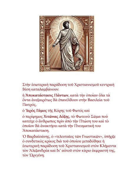 - Η Αποκατάστασις Πἀντων, κατά την οποίαν όλα τα όντα ανεξαιρέτως θα επανέλθουν στην Βασιλεία του Πατρός,