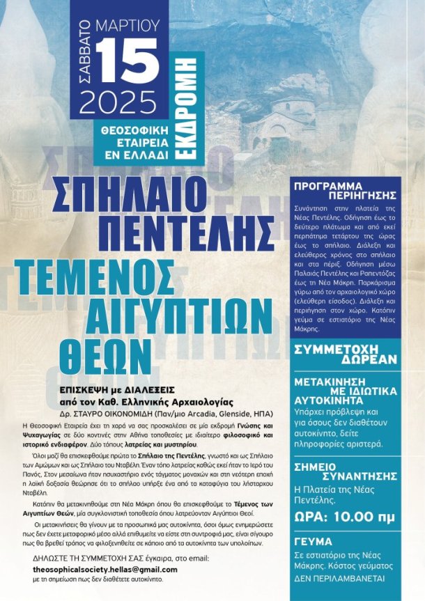 Η ΘΕεΕ έχει τη χαρά να σας προσκαλέσει σε μία εκδρομή Γνώσης και Ψυχαγωγίας σε δύο κοντινές στην Αθήνα τοποθεσίες με ιδιαίτερο φιλοσοφικό και ιστορικό ενδιαφέρον. Δύο τόπους λατρείας και μυστηρίου.