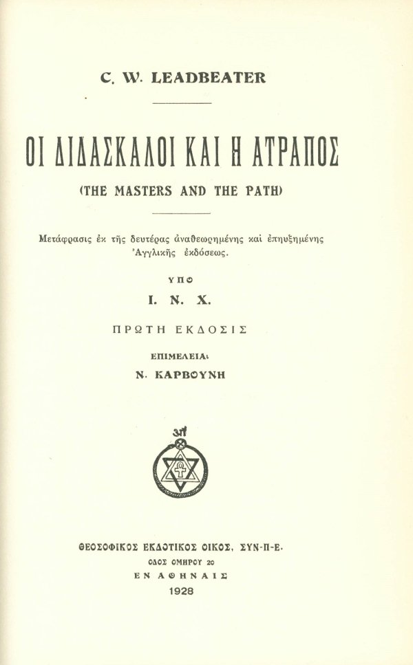 1η έκδοσις στην Ελληνική: 1928 Θεοσοφικός Εκδοτικός Οίκος ΣΥΝ.Π.Ε.