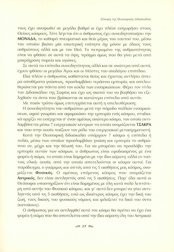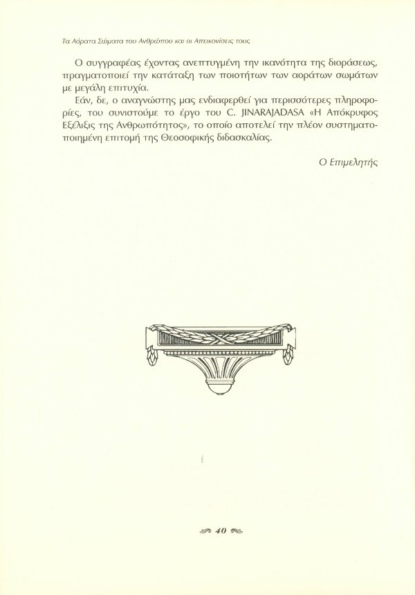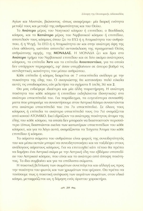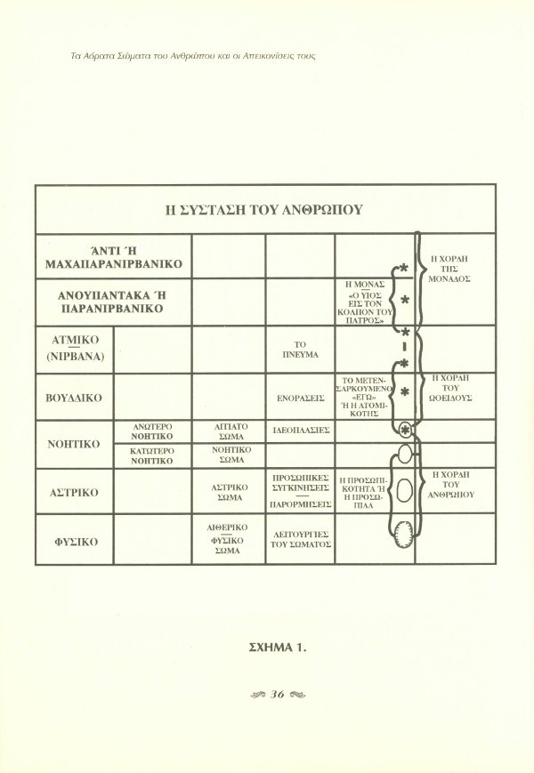 Τα αόρατα επίπεδα της Φύσεως · Η Διόραση · Οι φορείς (σώματα) του ανθρώπου · Η Τριαδικότης · Οι πρώτες Θεϊκές εκπορεύσεις · Η συλλογική ψυχή των ζώων · Η ανιούσα καμπή · Τα επίπεδα συνειδητότητας του ανθρώπου · Η τρίτη Θεία εκπόρευση · Πως εξελίσσεται ο άνθρωπος · Τα στοιχεία που μας αποδεικνύουν τα σώματά του (τους φορείς του) · Τα χρώματα των σωμάτων · Η σημασία τους · Ο πρωτόγονος άνθρωπος · Ο μέσος άνθρωπος · Αιφνίδιες συγκινήσεις · Η σημασία της σταθερότητας του Αστρικού σώματος · Ο εξελιγμένος άνθρωπος · Οι έγχρωμες απεικονίσεις των αοράτων σωμάτων του πρωτόγονου, του μέσου και του εξελιγμένου (καλλιεργημένου) ανθρώπου · Οι μορφές και οι απεικονίσεις που λαμβάνουν τα αόρατα σώματα κατά την εκδήλωση θυμού, αγάπης, φόβου, έρωτος, ευσέβειας, φιλαργυρίας, βαθειάς καταθλίψεως, θρησκοληψίας, και επιστημονικής καλλιέργειας · Η αύρα των Αγίων · Το Αστρικό σώμα του Μυημένου · Το Αιτιατό σώμα του Μύστου