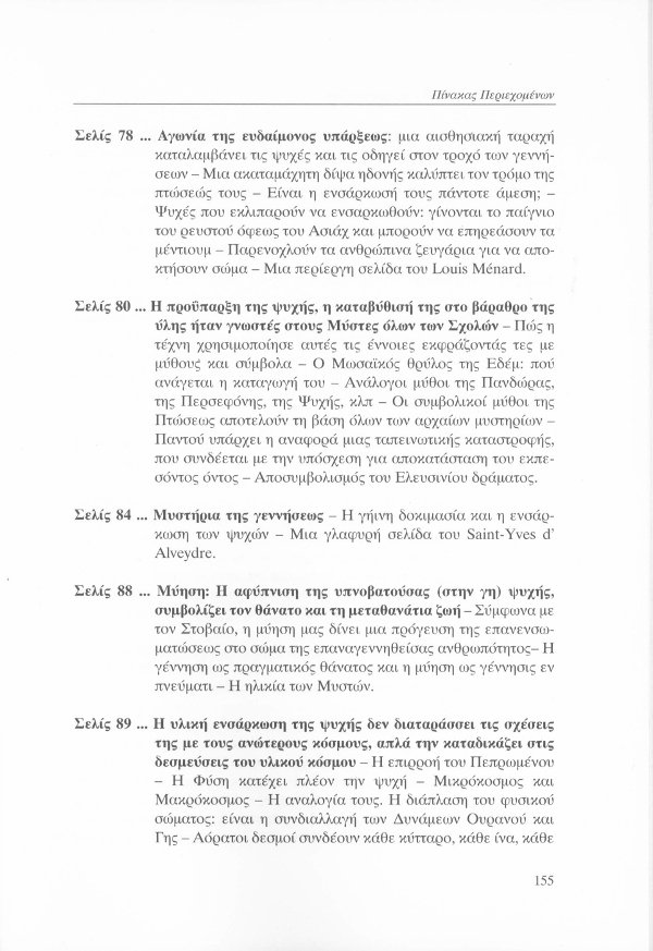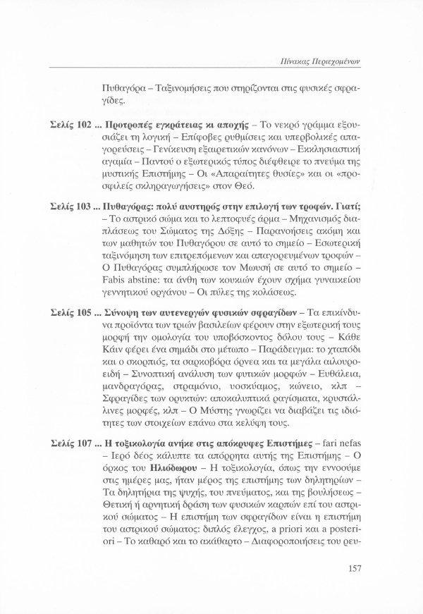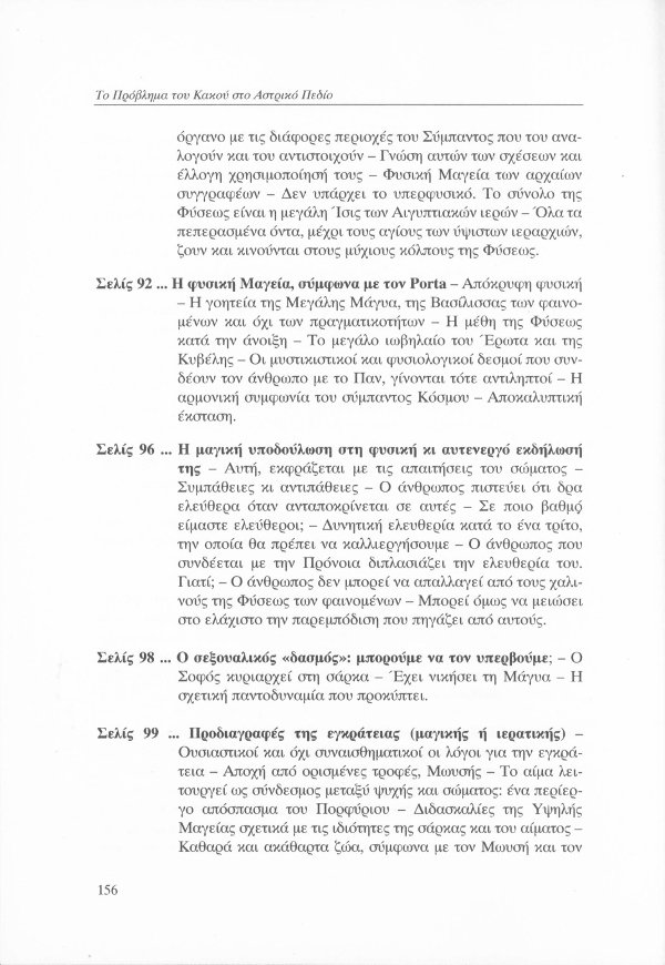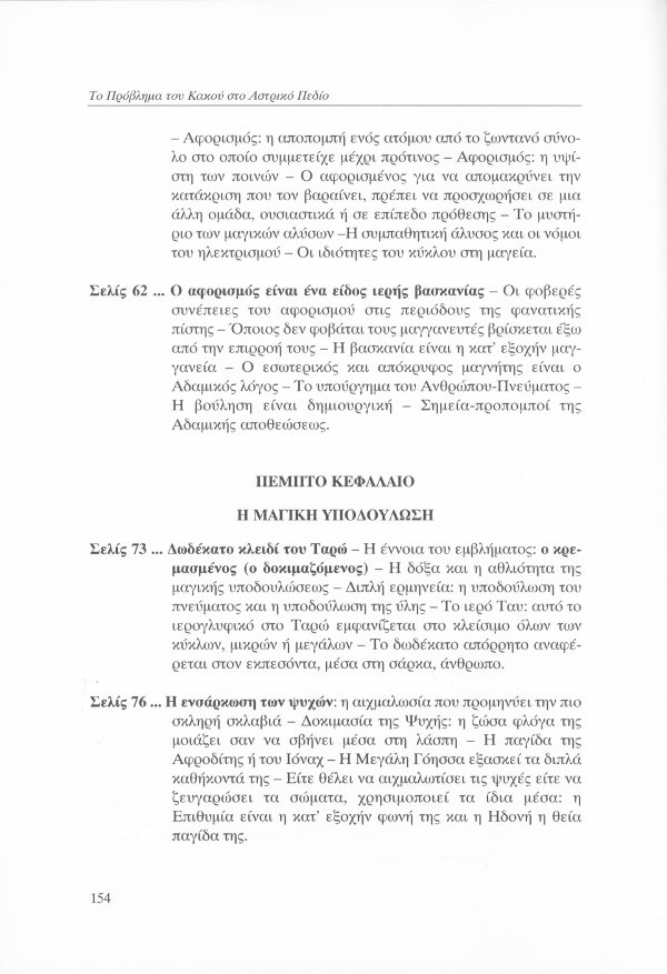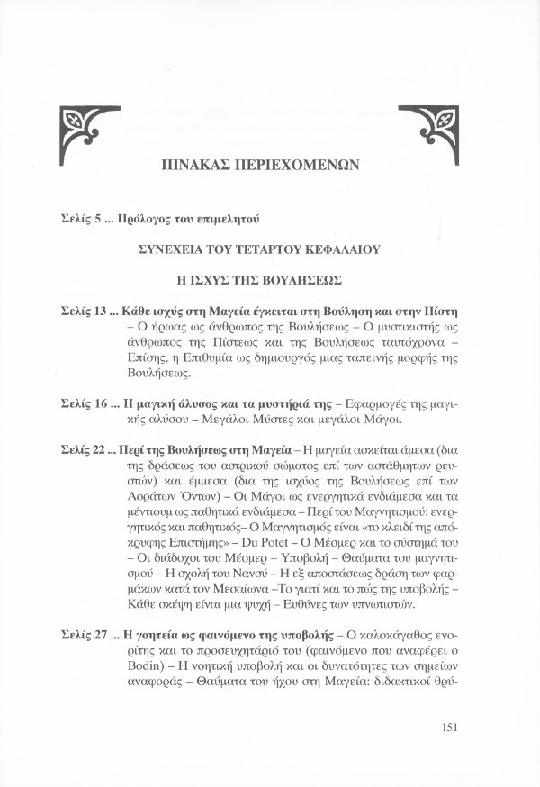 Κάθε ισχύς στην Μαγεία έγκειται στην Βούληση και την Πίστη · Η Μαγική `Αλυσος και τα μυστήριά της · Η Μαγεία ασκείται άμεσα δια της δράσεως του αστρικού σώματος επί των ασταθμήτων ρευστών κι έμμεσα δια της ισχύος της βουλήσεως επί των αοράτων όντων · Μαγνητισμός · Υποβολή · Ο Λόγος στον Αποκρυφισμό · Ο Πεντάκτινος Αστήρ και ο κύκλος των επικλήσεων · Ο Αστήρ του Μακροκόσμου και ο Αστήρ του Μικροκόσμου κατά τον Παράκελσο και η χρήση τους · Σημεία αναγνωρίσεως από τον ορατό στον αόρατο κόσμο · Η Μαγεία είναι η άσκηση της δημιουργικής ισχύος που την ανακτά κάποιος από την γήινη ζωή · Μετεωρισμός: ορατή μετακίνηση και αιώρηση αντικειμένων και ανθρώπων · Ατομικές ή συλλογικές βουλήσεις στην υπηρεσία του καλού ή του κακού · Ο αφορισμός αποτελεί είδος ιερής βασκανίας · Η προΰπαρξη της ψυχής και η καταβύθισή της στο βάραθρο της ύλης ήταν γνωστές στους Μύστες όλων των Σχολών · Μυστήρια της γεννήσεως · Η φυσική Μαγεία σύμφωνα με τον Porta · Προδιαγραφές της μαγικής και της ιερατικής εγκράτειας · Πυθαγόρας · Σύνοψη των αυτενεργών αστρικών σφραγίδων που υποδηλώνουν τα επικίνδυνα προϊόντα της γης · Η τοξικολογία παλαιά ανήκε στις απόκρυφες επιστήμες · Ψυχική Μαγεία: η μια ψυχή επιδρά άμεσα επί της άλλης, ανεξαρτήτως των αποστάσεων · Η καθ' εαυτή υποβολή · Η Ύπνωση · Παρενόχληση ή κατάληψη ενός ατόμου από μία παρασιτική οντότητα · Αποπλανήσεις επί των ρευμάτων του Αστρικού · Πνευματική υποδούλωση · Τα Στοιχειακά και τα Πνεύματα των τόπων · Η συμπεριφορά τους έναντι των ανθρώπων · Λάρβες, οι πρωταίτιοι των αυτοκτονιών · Αναγέννηση της Μαγείας · Η εξοικείωση με τον κόσμο των Αοράτων όντων είναι συνήθως αρνητική · Οι κατ' εξαίρεση σχέσεις με ανώτερες Διάνοιες, ένδοξες Ψυχές ή Αγγέλους ·